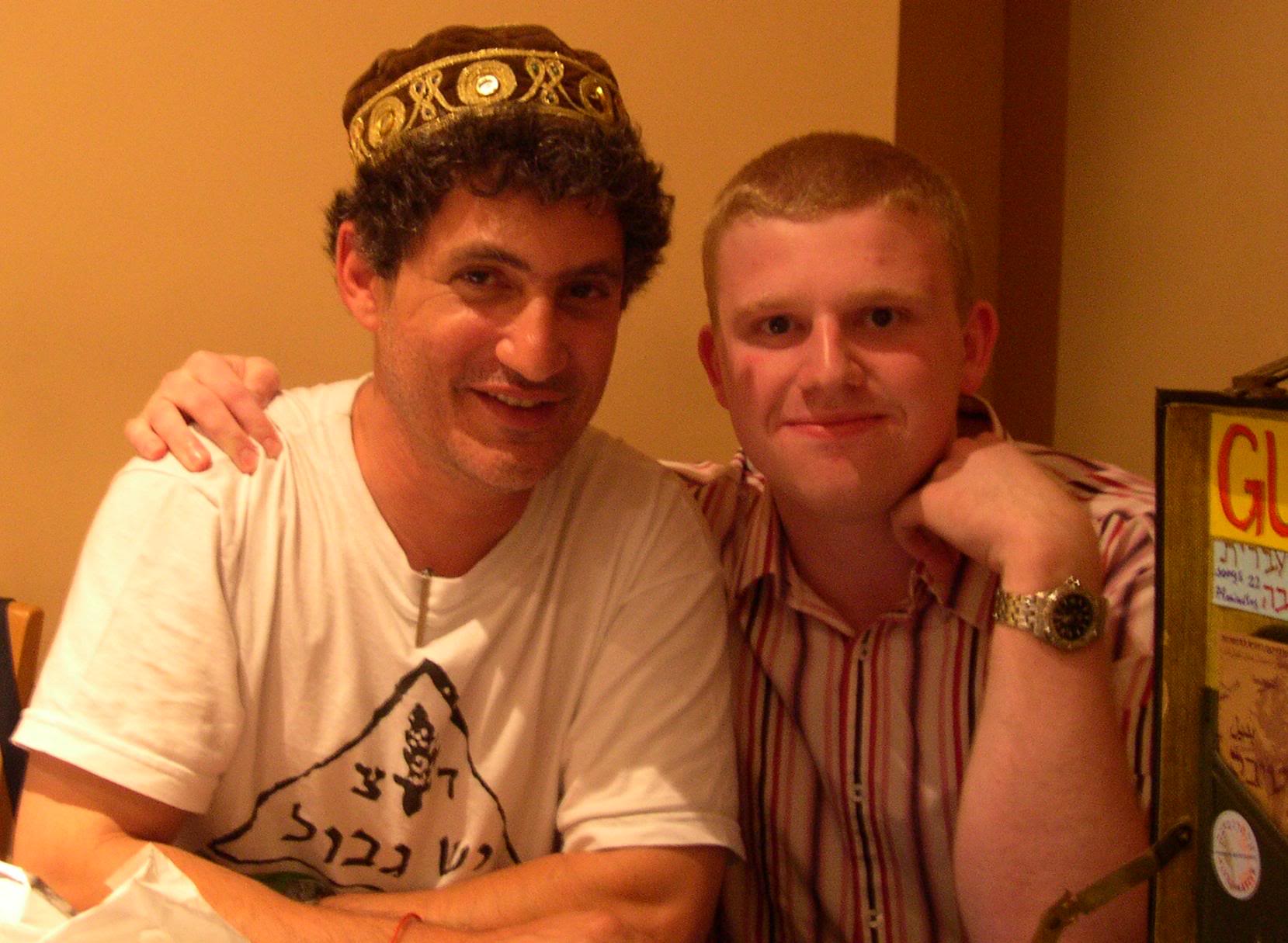 So, after months of correspondence and becoming pretty good friends via e-mail, Ofer's article finally got published at Stylus on Monday. I worked right up to the mark: in fact, between finishing the piece, bouncing around to Morrissey in amongst a throng of baying Mancunians and punching numbers into a machine for The Man, it's been a hectic few days. All that came to a head on Monday night, when I travelled to Manchester to sit upstairs in a Palestinian-run kebab shop with members of Jews For Justice For Palestinians and the Olive Co-op, as well as interested British activists and of course, Ofer himself. Ofer thanked me for writing the piece (of which, a printed copy was handed round to the group), and I would like to thank Ofer in return for his complimentary copy of his new album with the Newlife Community, Wind, Spirit, for being such a patient and helpful subject, and above all, for being a such a great character. Ofer played solo acoustic versions of songs from Alternative (surely you've ordered a copy now?), Cohen classic "Story Of Isaac" and some further, heated discussion of the points raised by people like him. He travelled light: a change of clothes in his guitar case, a brief case of CDs (along with toothpaste, toothbrush and electric razor) and a trolley with a tiny amp and microphone attached. All of this enabled maximum flexibility; including an impromptu "gig" in the kebab shop itself (perhaps not the best place to bring culture), and some mid-afternoon busking in central Manchester. Israeli-jazz-flamenco-folk-protest-singing-showmanship-humour-activism is the new rock n' roll. Mos def.